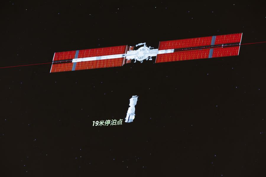 Image prise au Centre de contrôle aérospatial de Beijing montrant l'amarrage entre le vaisseau spatial habité Shenzhou-20 et le module central Tianhe de la station spatiale, le 24 avril 2025. (Photo : Jin Liwang)