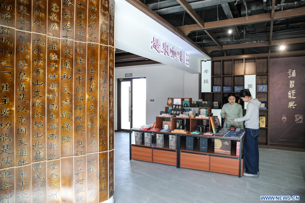 DUNHUANG, 2 mai (Xinhua) -- Un visiteur achète des souvenirs sur le site touristique des ruines de Xuanquanzhi à Dunhuang, dans la province chinoise du Gansu (nord-ouest), le 29 avril 2025.