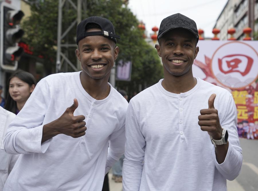 Photographie de jumeaux tchadiens lors du 19e Festival international des jumeaux à Mojiang, dans le district autonome hani de Mojiang, dans la province du Yunnan (sud-ouest de la Chine), le 1er mai 2025.(Photo : Chen Xinbo)