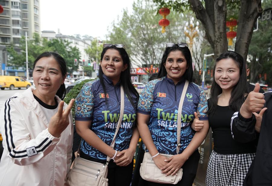 Deux jumelles sri-lankaises posent pour une photo avec des habitants lors du 19e Festival international des jumeaux à Mojiang, dans le district autonome hani de Mojiang, dans la province du Yunnan (sud-ouest de la Chine), le 1er mai 2025. (Photo : Chen Xinbo)■