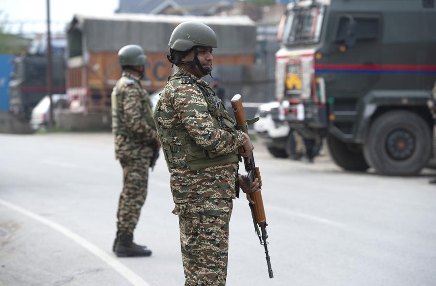 Des éléments paramilitaires indiens montent la garde près d'un point de contrôle à la périphérie de la ville de Srinagar, chef-lieu du Cachemire sous contrôle indien, le 7 mai 2025. Tôt mercredi, l'armée indienne a déclaré avoir pris pour cible neuf sites au Pakistan et dans le Cachemire sous contrôle pakistanais. (Xinhua/Javed Dar)■