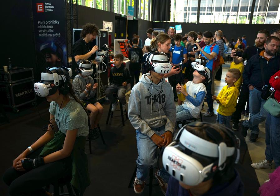 PRAGUE, 12 mai (Xinhua) -- Des enfants participent à la visite virtuelle d'une centrale électrique lors du salon Maker Faire Prague 2025 à Prague, en Républiqe tchèque, le 11 mai 2025. Le salon de la créativité, d'une durée de deux jours, met en lumière une combinaison de technologie moderne et d'artisanat traditionnel. (Xinhua/Dana Kesnerova)