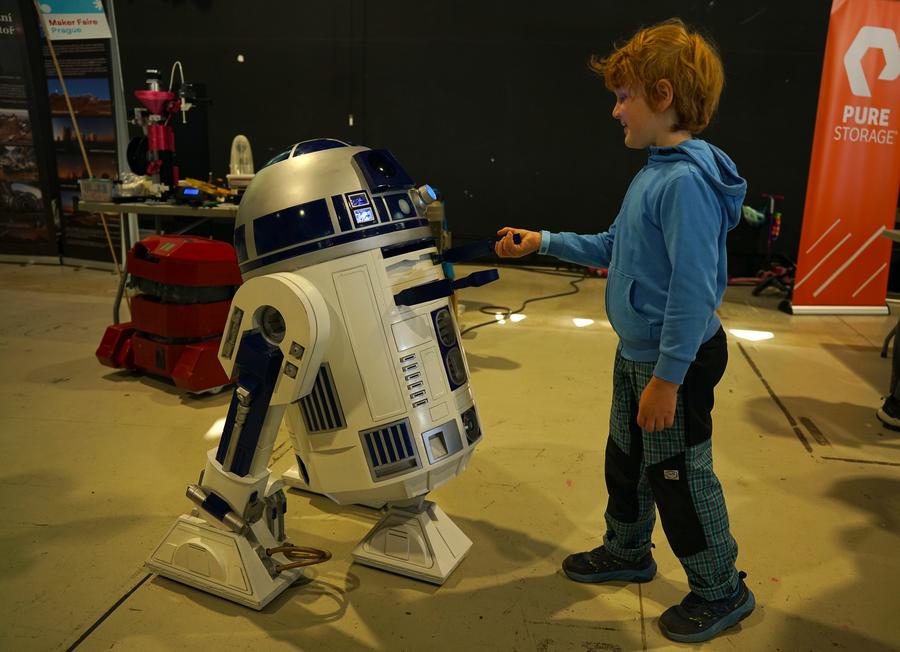 PRAGUE, 12 mai (Xinhua) -- Un garçon interagit avec un robot lors du salon Maker Faire Prague 2025 à Prague, en République Tchèque, le 11 mai 2025. Le salon de la créativité, d'une durée de deux jours, met en lumière une combinaison de technologie moderne et d'artisanat traditionnel. (Xinhua/Dana Kesnerova)