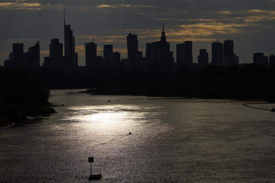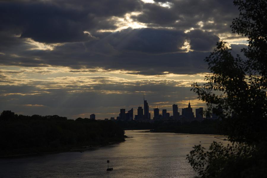 VARSOVIE, 13 mai (Xinhua) -- Le soleil se couche sur la ligne d'horizon de la ville, vu depuis un pont enjambant la Vistule à Varsovie, en Pologne, le 12 mai 2025. (Xinhua/Jaap Arriens)