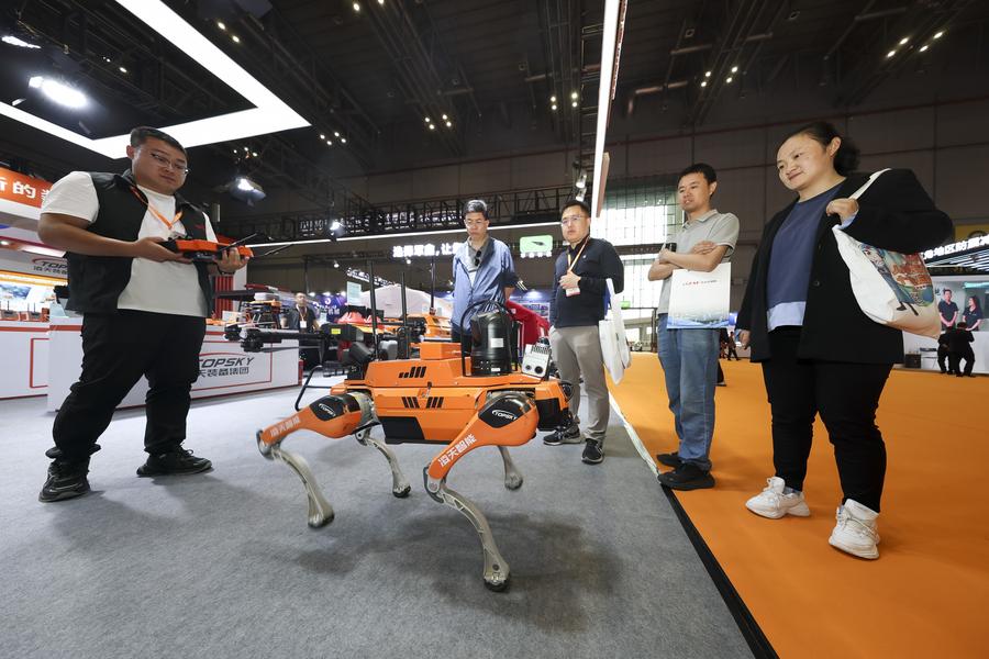 Un employé présente aux visiteurs un chien robot quadrupède pouvant être utilisé pour les secours d'urgence sur le stand de la Beijing Topsky Intelligent Equipment Group Co., Ltd. lors de la quatrième Exposition internationale sur la réduction des catastrophes et les secours d'urgence du delta du fleuve Yangtsé, à Shanghai, dans l'est de la Chine, le 13 mai 2025. (Photo : Wang Xiang)