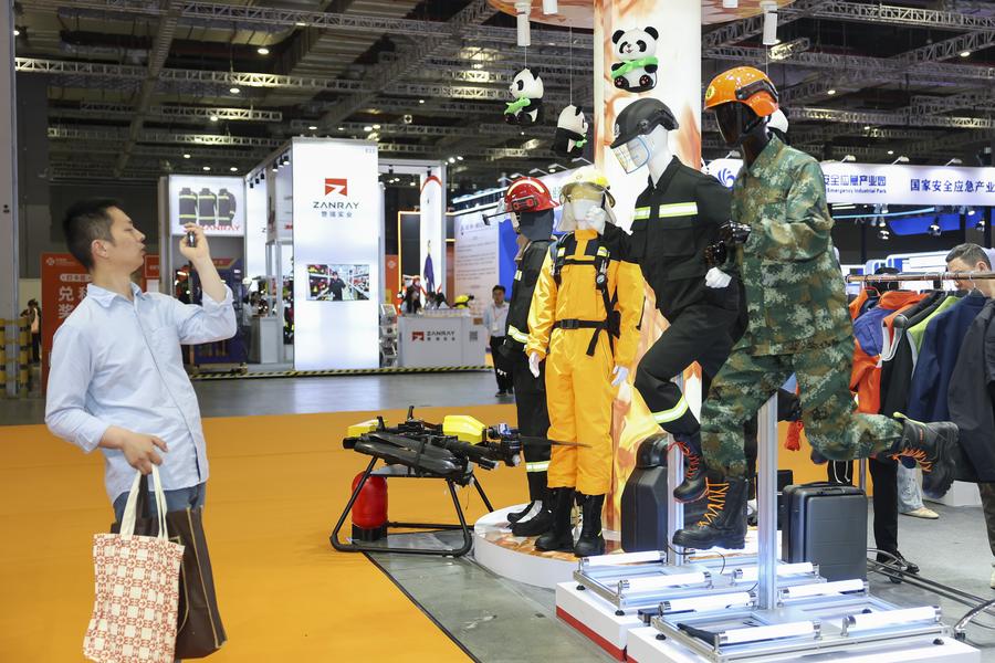 Un visiteur prend des photos de tenues de pompiers, lors de la quatrième Exposition internationale sur la réduction des catastrophes et les secours d'urgence du delta du fleuve Yangtsé, à Shanghai, dans l'est de la Chine, le 13 mai 2025. (Photo : Wang Xiang)