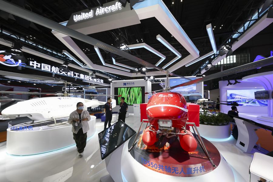Un hélicoptère sans pilote utilisé pour les secours d'urgence sur le stand de l'entreprise chinoise United Aircraft, lors de la quatrième Exposition internationale sur la réduction des catastrophes et les secours d'urgence du delta du fleuve Yangtsé, à Shanghai, dans l'est de la Chine, le 13 mai 2025. (Photo : Wang Xiang)■