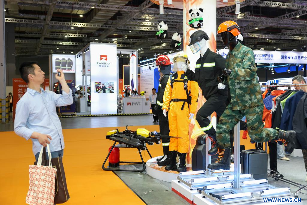SHANGHAI, 15 mai (Xinhua) -- Un visiteur prend des photos de tenues de pompiers, lors de la quatrième Exposition internationale sur la réduction des catastrophes et les secours d'urgence du delta du fleuve Yangtsé, à Shanghai, dans l'est de la Chine, le 13 mai 2025. Plus de 3.000 équipements et technologies de pointe sont présentés à l'exposition.