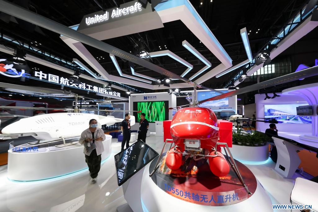 SHANGHAI, 15 mai (Xinhua) -- Un hélicoptère sans pilote utilisé pour les secours d'urgence sur le stand de l'entreprise chinoise United Aircraft, lors de la quatrième Exposition internationale sur la réduction des catastrophes et les secours d'urgence du delta du fleuve Yangtsé, à Shanghai, dans l'est de la Chine, le 13 mai 2025. Plus de 3.000 équipements et technologies de pointe sont présentés à l'exposition.