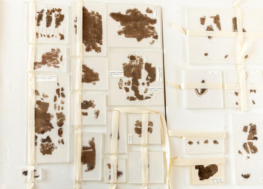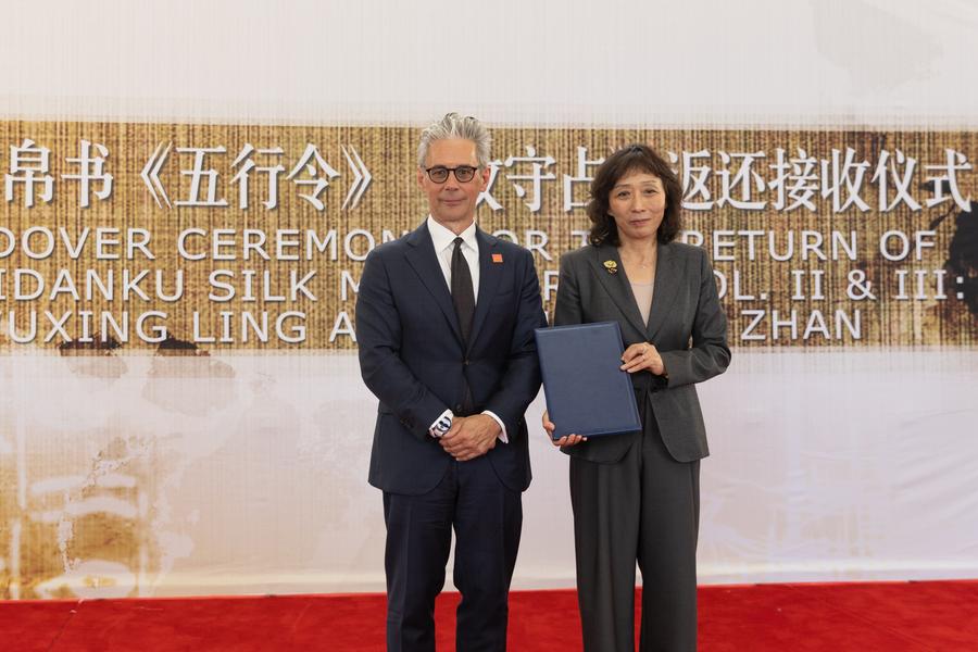 WASHINGTON, 17 mai (Xinhua) -- Zhu Ye (à droite), directrice générale adjointe du Bureau pour la récupération et la restitution des biens culturels perdus, de l'Administration nationale du patrimoine culturel de Chine, reçoit un certificat de transfert de Chase Robinson, directeur du Musée national d'art asiatique au Smithsonian, lors d'une cérémonie de remise de manuscrits anciens de soie de Zidanku datant de la période antique des Royaumes combattants à l'ambassade de Chine aux Etats-Unis à Washington, le 16 mai 2025. Vendredi, ce musée a officiellement restitué les volumes II et III des manuscrits de Zidanku, "Wuxing Ling" et "Gongshou Zhan", à l'Administration nationale du patrimoine culturel de Chine.(Xinhua/Hu Yousong)Les anciens manuscrits de soie de Zidanku, datant de la période antique des Royaumes combattants, sont exposés lors d'une cérémonie de remise à l'ambassade de Chine aux Etats-Unis à Washington, le 16 mai 2025. (Xinhua/Hu Yousong)
