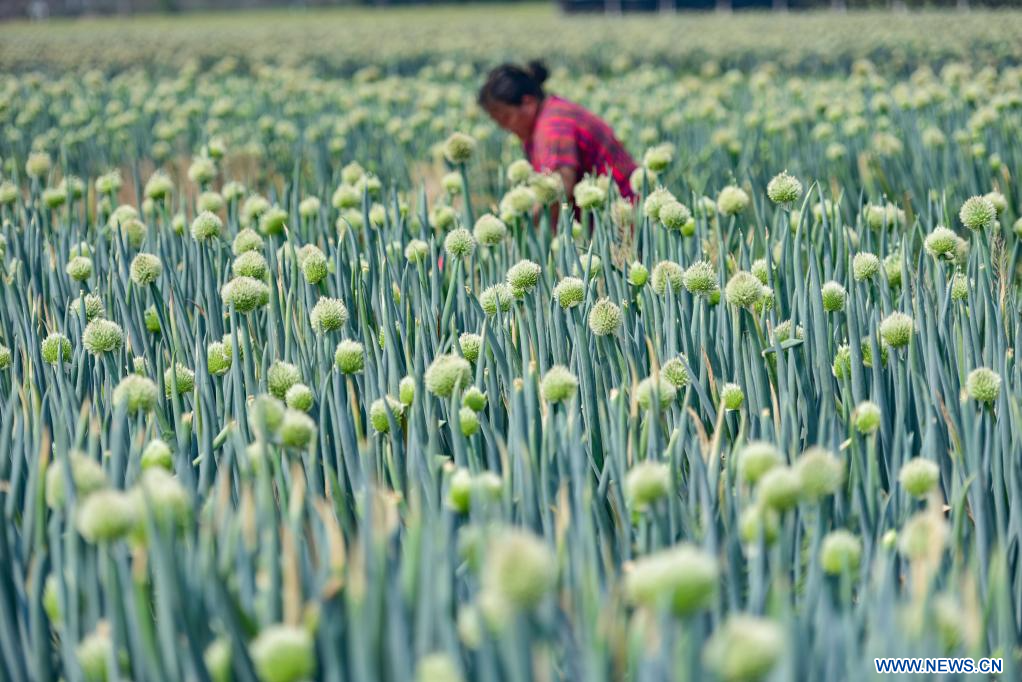 BEIJING, 22 mai (Xinhua) -- Une maraîchère entretient des ciboules dans un champ à Qingzhou, dans la province chinoise du Shandong (est), le 21 mai 2025.