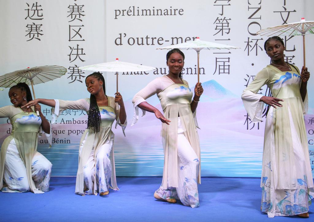 COTONOU, 25 mai (Xinhua) -- Des concurrents dansent lors de la 24e édition du concours "Pont vers le chinois" au Bénin, une compétition de langue et de culture chinoises organisée le 23 mai 2025 au Centre culturel chinois à Cotonou. (Xinhua/Seraphin Zounyekpe)
