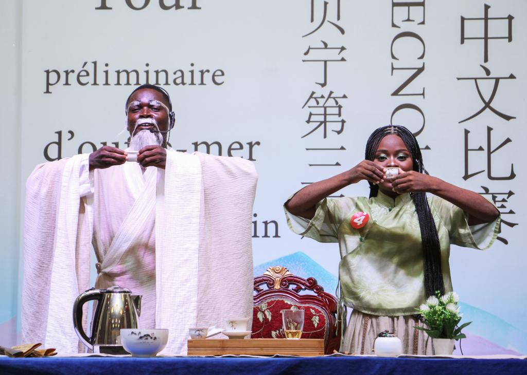 COTONOU, 25 mai (Xinhua) -- Des participants présentent une cérémonie du thé lors de la 24e édition du concours "Pont vers le chinois" au Bénin, une compétition de langue et de culture chinoises organisée le 23 mai 2025 au Centre culturel chinois à Cotonou. (Xinhua/Seraphin Zounyekpe)
