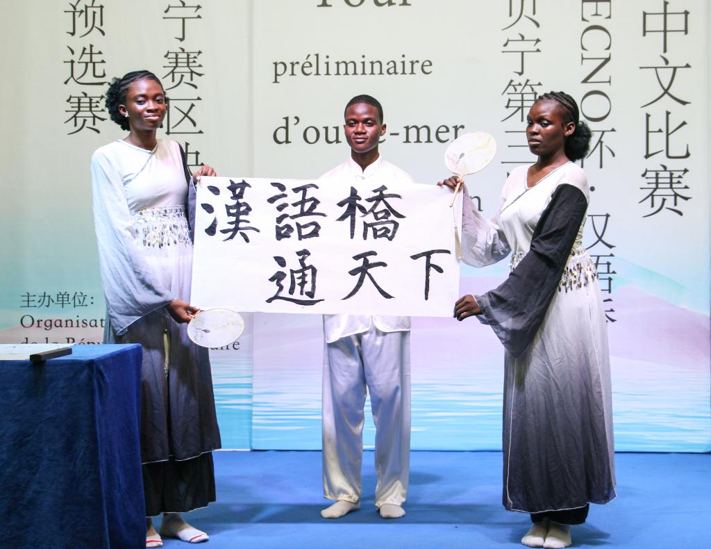 COTONOU, 25 mai (Xinhua) -- Des concurrents font une démonstration de calligraphie chinoise lors de la 24e édition du concours "Pont vers le chinois" au Bénin, une compétition de langue et de culture chinoises organisée le 23 mai 2025 au Centre culturel chinois à Cotonou. (Xinhua/Seraphin Zounyekpe)