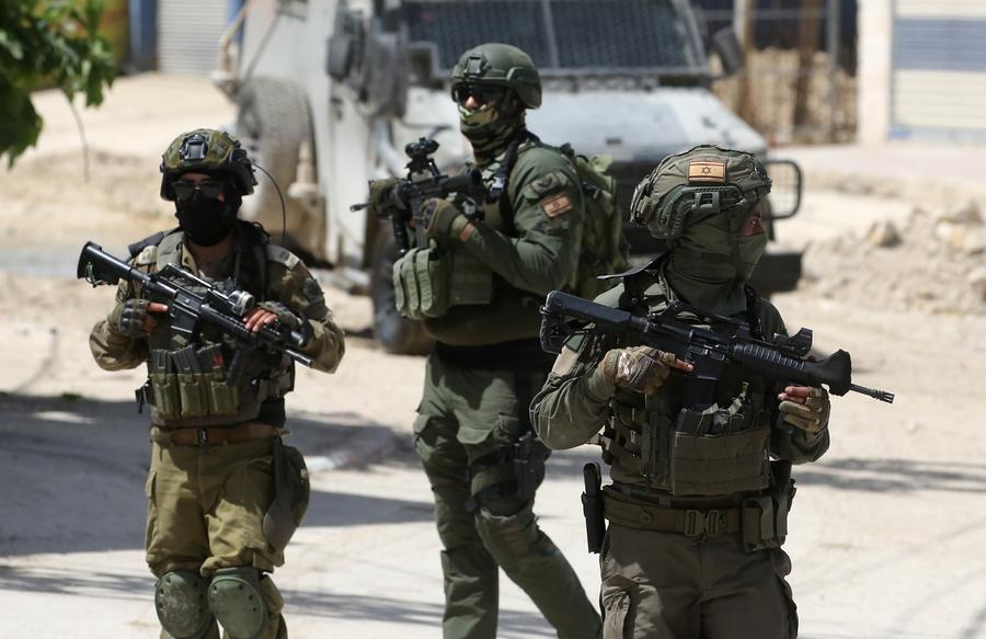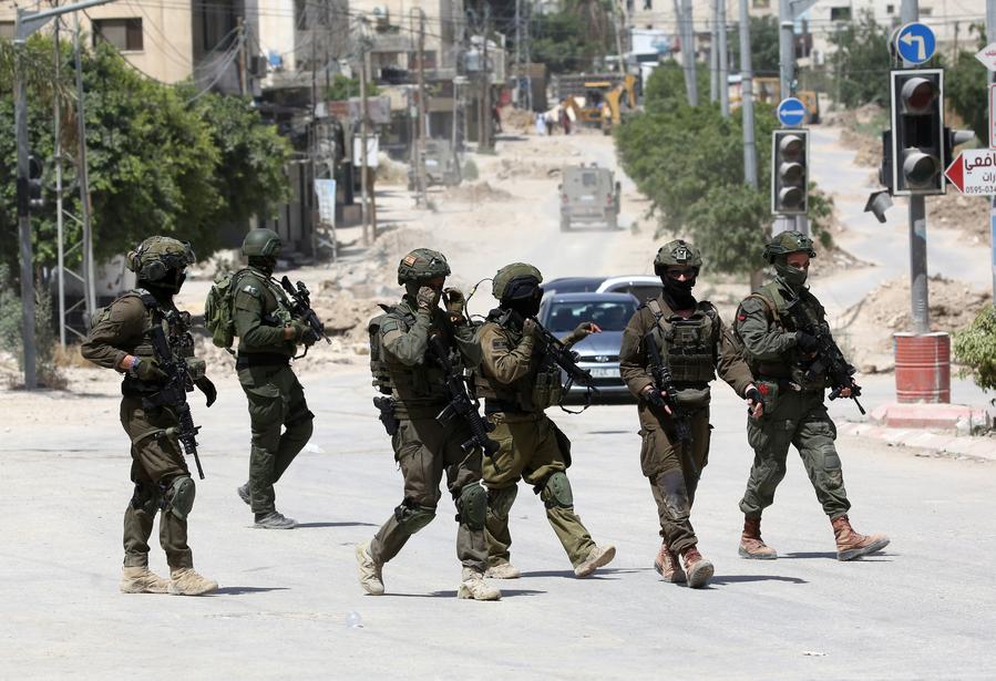 TULKAREM, 27 mai (Xinhua) -- Des soldats israéliens marchent dans la rue lors d'une opération militaire israélienne dans le camp de réfugiés de Tulkarem, dans le nord de la Cisjordanie, le 26 mai 2025. (Xinhua/Nidal Eshtayeh)