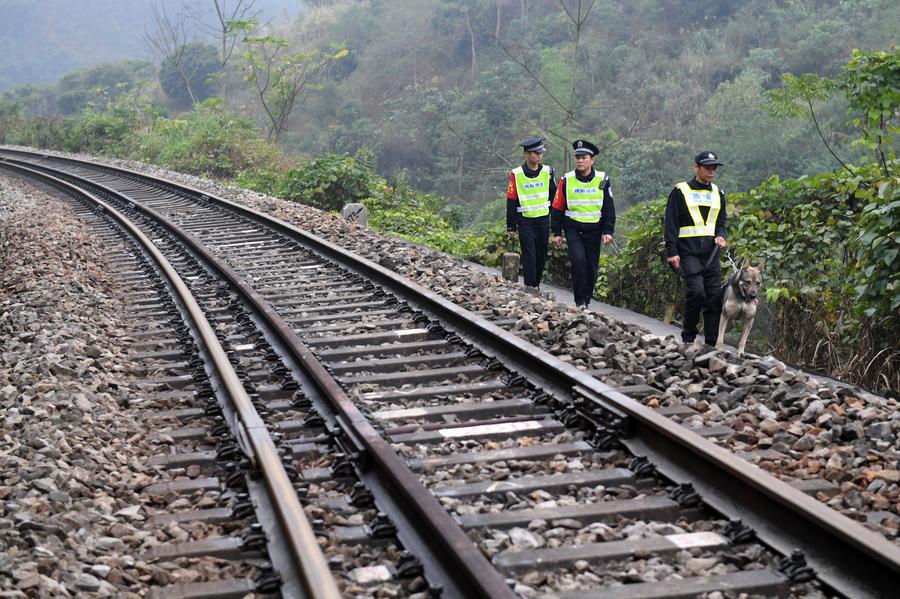 Lu Rifeng (au centre), agent de la police ferroviaire de Nanning, patrouille sur la voie ferrée avec ses collègues dans la région autonome Zhuang du Guangxi (sud de la Chine), le 21 janvier 2020. (Photo : Lu Boan)