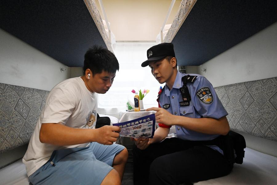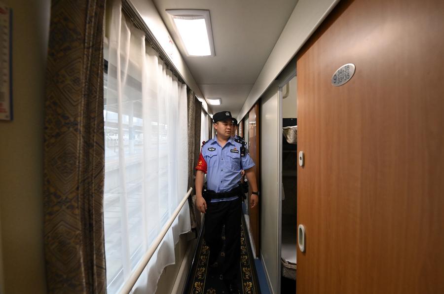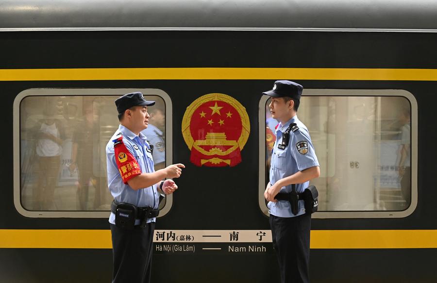 He Jianlin (à gauche), agent de la police ferroviaire de Nanning, discute avec son collègue Wang Rongxin devant un train à destination de Hanoi, à la gare de Nanning, capitale de la région autonome Zhuang du Guangxi (sud de la Chine), le 25 mai 2025. (Photo : Lu Boan)Lu Rifeng (à gauche), agent de la police ferroviaire de Nanning, et son collègue Yang Tieming lors de la relève de service à la gare de Pingxiang, dans la région autonome Zhuang du Guangxi (sud de la Chine), le 20 janvier 2017. (Photo : Lu Boan)He Jianlin (à droite), agent de la police ferroviaire de Nanning, explique les consignes de sécurité à un passager à bord d'un train à destination de Hanoi, à la gare de Nanning, capitale de la région autonome Zhuang du Guangxi (sud de la Chine), le 25 mai 2025. (Photo : Lu Boan)Wang Rongxin, agent de la police ferroviaire de Nanning, est en service avec un collègue à bord d'un train à destination de Hanoi, à la gare de Nanning, capitale de la région autonome Zhuang du Guangxi (sud de la Chine), le 25 mai 2025. (Photo : Lu Boan)■