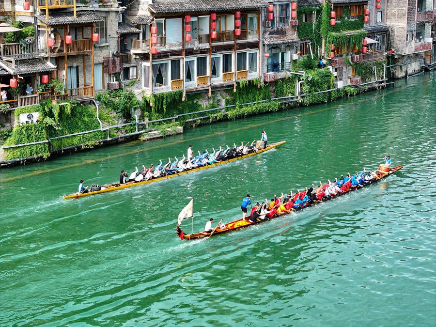 Des habitants pagayent sur des bateaux-dragons dans la vielle ville de Zhenyuan, dans la préfecture autonome Miao et Dong de Qiandongnan, dans la province chinoise du Guizhou (sud-ouest), le 20 mai 2025.(Photo : Ou Dongqu)