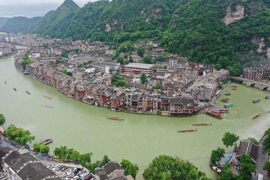 Une photo aérienne prise par un drone montre des habitants pagayant sur des bateaux-dragons dans la vielle ville de Zhenyuan, dans la préfecture autonome Miao et Dong de Qiandongnan, dans la province chinoise du Guizhou (sud-ouest), le 31 mai 2025.(Photo : Yuan Fuhong)
