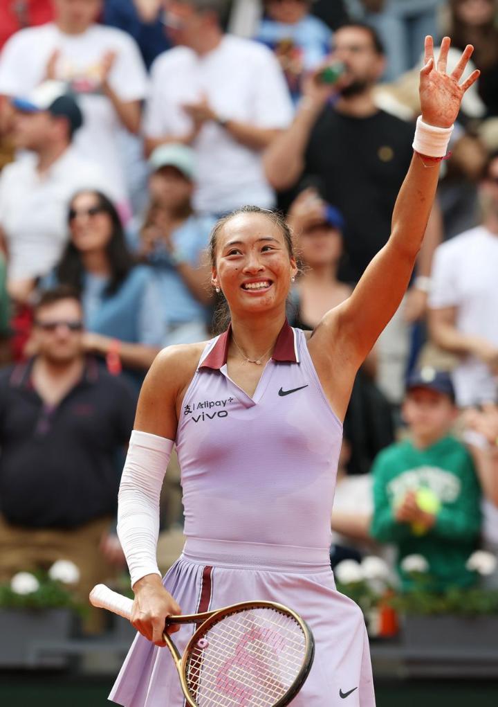 La Chinoise Zheng Qinwen célèbre sa victoire après avoir remporté le match du 4e tour du simple dames face à la Russe Liudmila Samsonova au tournoi de tennis de Roland-Garros, à Paris, en France, le 1er juin 2025. (Xinhua/Gao Jing)