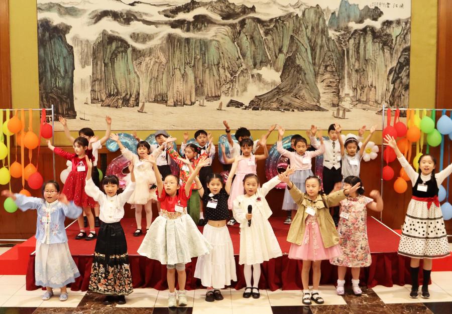 TOKYO, 2 juin (Xinhua) -- Des enfants chinois et japonais donnent un spectacle en célébration de la Journée internationale de l'enfance à l'ambassade de Chine au Japon, à Tokyo, au Japon, le 1er juin 2025. (Xinhua/Yang Guang)