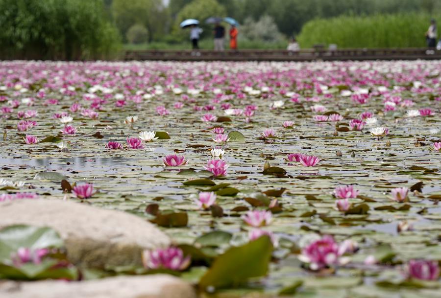 YINCHUAN, 4 juin (Xinhua) -- Pendant les congés de la Fête des bateaux-dragons, les nénuphars en pleine floraison tapissaient le lac du Parc d'exposition florale de Chine, à Yinchuan, capitale de la région autonome Hui du Ningxia (nord-ouest de la Chine).