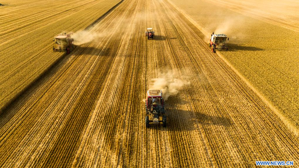 BEIJING, 7 juin (Xinhua) -- Photo de moissonneuses en pleine activité dans les champs à Pantang, village de la ville de Shangqiu, dans la province chinoise du Henan (centre), le 4 juin 2025. (Photo : Li Heng)