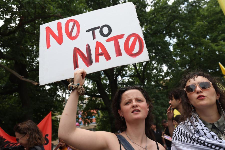 LA HAYE, 23 juin (Xinhua) -- Une femme tient une pancarte parmi les manifestants réunis à la Haye, aux Pays-Bas, le 22 juin 2025. La manifestation, qui a rassemblé des centaines de personnes, s'est déroulée à la veille du sommet de l'OTAN, où les pays membres devraient aborder une augmentation des dépenses de défense. Censée s'opposer à l'OTAN et à la guerre à Gaza, la manifestation a également attiré des protestataires contre la guerre en Iran suite aux dernières frappes américaines sur trois installations nucléaires iraniennes. (Xinhua/Zhao Dingzhe)