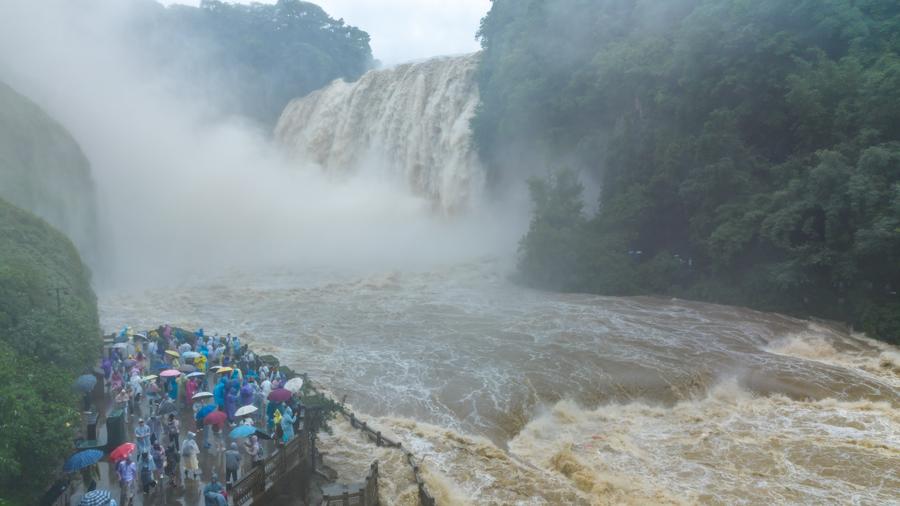 Des touristes admirent le paysage de la cascade de Huangguoshu à Anshun, ville de la province chinoise du Guizhou (sud-ouest), le 26 juin 2025.(Photo : Chen Xi)