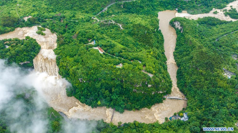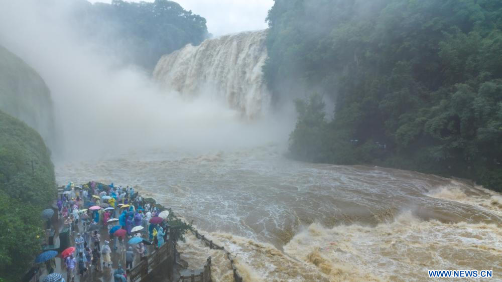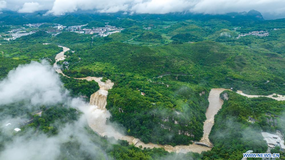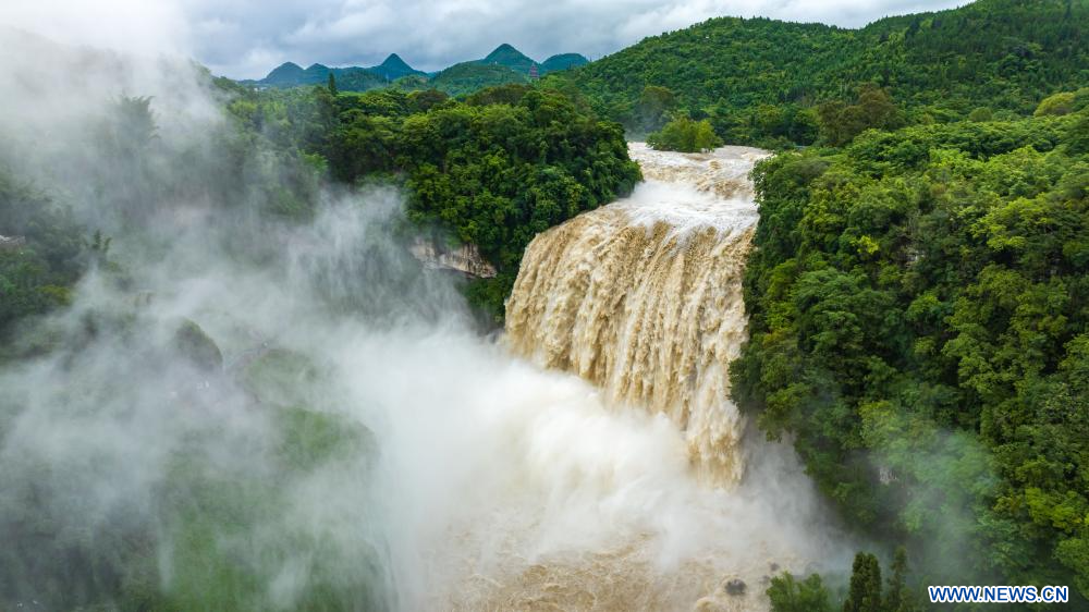 En raison de pluies persistantes, la cascade de Huangguoshu a atteint jeudi son débit maximal de la saison des crues cette année, avec un flux de 528 mètres cubes par seconde. (Photo : Chen Xi)