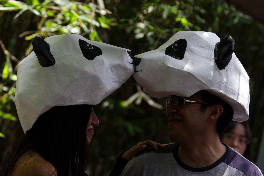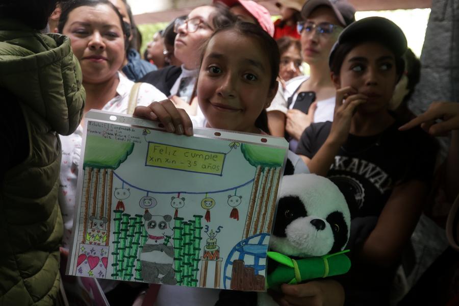 MEXICO, 30 juin (Xinhua) -- Le panda géant femelle Xin Xin avec son gâteau d'anniversaire symbolique au zoo de Chapultepec à Mexico, capitale du Mexique, le 29 juin 2025. La célébration du 35e anniversaire de Xin Xin s'est déroulée ici dimanche. Les festivités comprenaient une danse traditionnelle du lion, une exposition d'œuvres d'art sur le thème des pandas géants et une cérémonie avec un gâteau d'anniversaire, qui ont attiré une foule nombreuse dans une ambiance animée. En 1975, le gouvernement chinois a offert deux pandas géants, Ying Ying et Pe Pe, au gouvernement mexicain. Leur descendante, Xin Xin, est née au Mexique le 1er juillet 1990. (Xinhua/Li Mengxin)Une jeune fille montre une peinture sur le thème des pandas géants au zoo de Chapultepec à Mexico, capitale du Mexique, le 29 juin 2025. (Xinhua/Francisco Canedo)Des visiteurs portant des chapeaux en forme de panda géant posent pour une photo au zoo de Chapultepec à Mexico, capitale du Mexique, le 29 juin 2025. (Xinhua/Francisco Canedo)