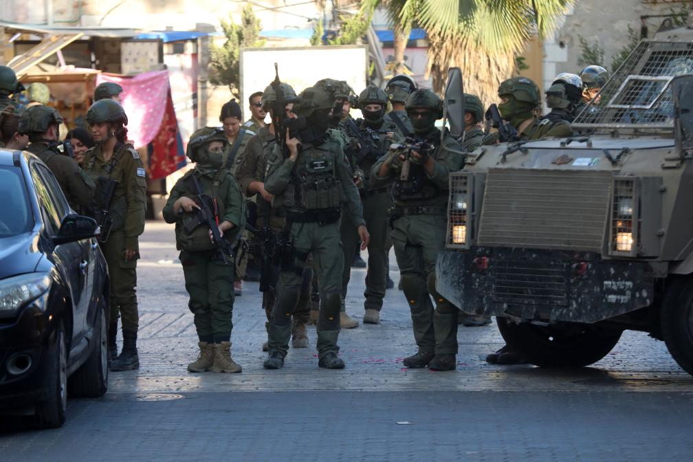 HEBRON, 29 juin (Xinhua) -- Des membres des forces israéliennes sécurisent les rues pour les colons israéliens dans la vieille ville d'Hébron, dans le sud de la Cisjordanie, le 28 juin 2025. (Xinhua/Mamoun Wazwaz)