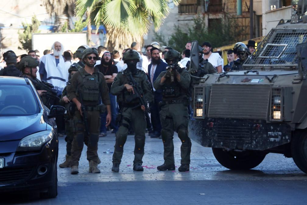 HEBRON, 29 juin (Xinhua) -- Des membres des forces israéliennes sécurisent les rues pour les colons israéliens dans la vieille ville d'Hébron, dans le sud de la Cisjordanie, le 28 juin 2025. (Xinhua/Mamoun Wazwaz)