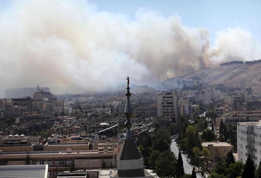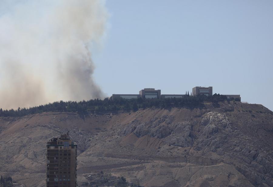 DAMAS, 5 juillet (Xinhua) -- De la fumée s'élève à la suite d'un incendie intervenu près du palais présidentiel syrien al-Chaab à Damas, en Syrie, le 4 juillet 2025. Un feu d'origine inconnue s'est déclaré vendredi après-midi près du palais, situé au sommet d'une colline surplombant Damas, dégageant des colonnes de fumée noire au-dessus de vastes étendues, selon des médias locaux et des témoins. (Xinhua/Ammar Safarjalani)