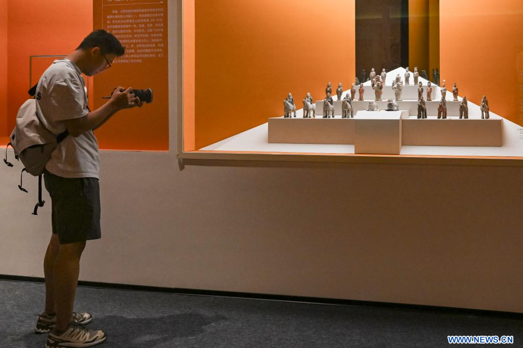 SHANGHAI, 9 juillet (Xinhua) -- Un professionnel des médias photographie des figurines en poterie présentées lors d'une exposition de reliques culturelles au Musée de Shanghai Est, à Shanghai, dans l'est de la Chine, le 8 juillet 2025. Cette exposition, qui présente plus de 300 reliques culturelles provenant de la ville de Guyuan, dans la région autonome Hui du Ningxia (nord-ouest de la Chine), a ouvert ses portes à Shanghai mardi. (Photo : Chen Haoming)
