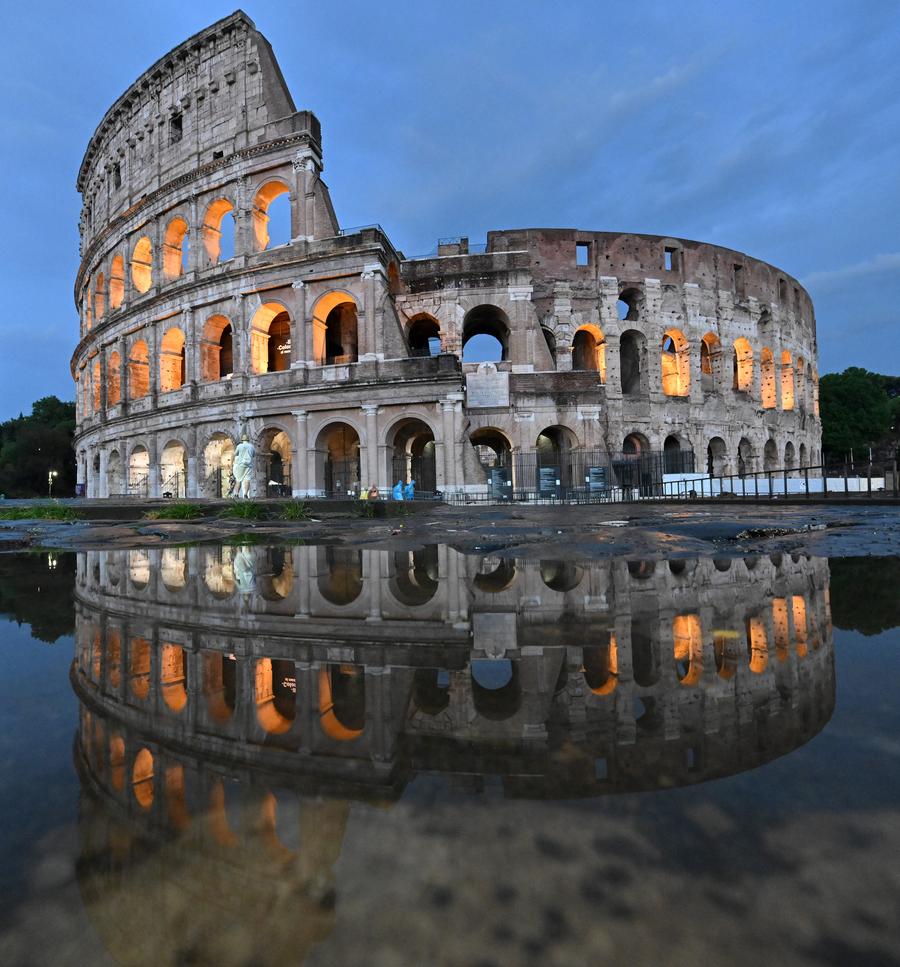 ROME, 14 juillet (Xinhua) -- Cette photo prise le 13 juillet 2025 montre le Colisée et son reflet dans l'eau de pluie à Rome, en Italie. (Xinhua/Alberto Lingria)