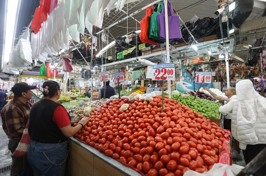 MEXICO, 15 juillet (Xinhua) -- Des gens achètent les tomates sur un marché public à Mexico, capitale du Mexique, le 14 juillet 2025. Le ministère américain du Commerce a annoncé lundi qu'il imposait immédiatement un droit de douane de 17,09% sur la plupart des tomates fraîches importées du Mexique, marquant ainsi le retrait de l'accord conclu en 2019 entre les deux pays visant à suspendre l'enquête antidumping sur les tomates fraîches. (Xinhua/Francisco Canedo)