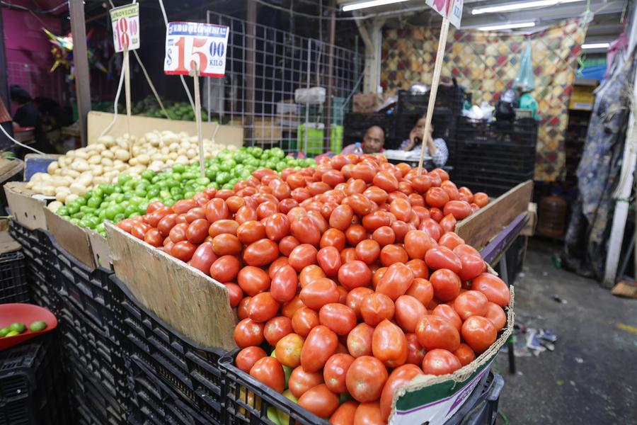 MEXICO, 15 juillet (Xinhua) -- Des tomates sur un étalage d'un marché public à Mexico, capitale du Mexique, le 14 juillet 2025. Le ministère américain du Commerce a annoncé lundi qu'il imposait immédiatement un droit de douane de 17,09% sur la plupart des tomates fraîches importées du Mexique, marquant ainsi le retrait de l'accord conclu en 2019 entre les deux pays visant à suspendre l'enquête antidumping sur les tomates fraîches. (Xinhua/Francisco Canedo)