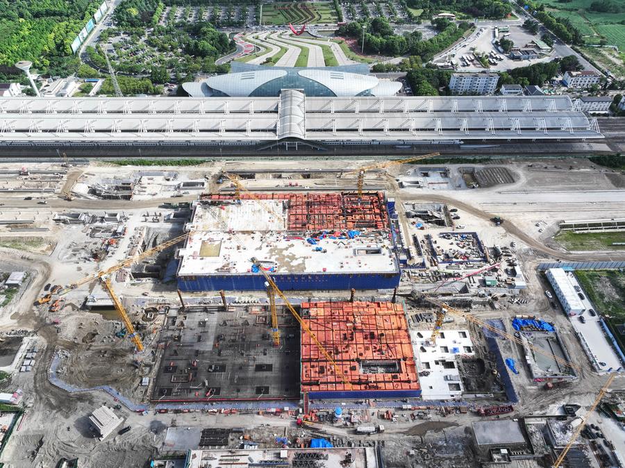 Photo aérienne prise par drone montrant le chantier de construction de la gare de Nantong à Nantong, dans la province du Jiangsu (est de la Chine), le 21 juillet 2025. (Photo : Ji Chunpeng)