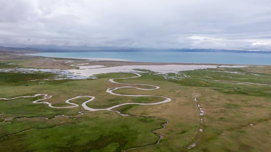 Photo aérienne prise par drone le 22 juillet 2025 montrant le paysage d'une zone humide près du lac Mapam Yumco dans le district de Burang de la préfecture de Ngari, dans la région autonome du Xizang (sud-ouest de la Chine). (Photo : Tenzing Nima Qadhup)