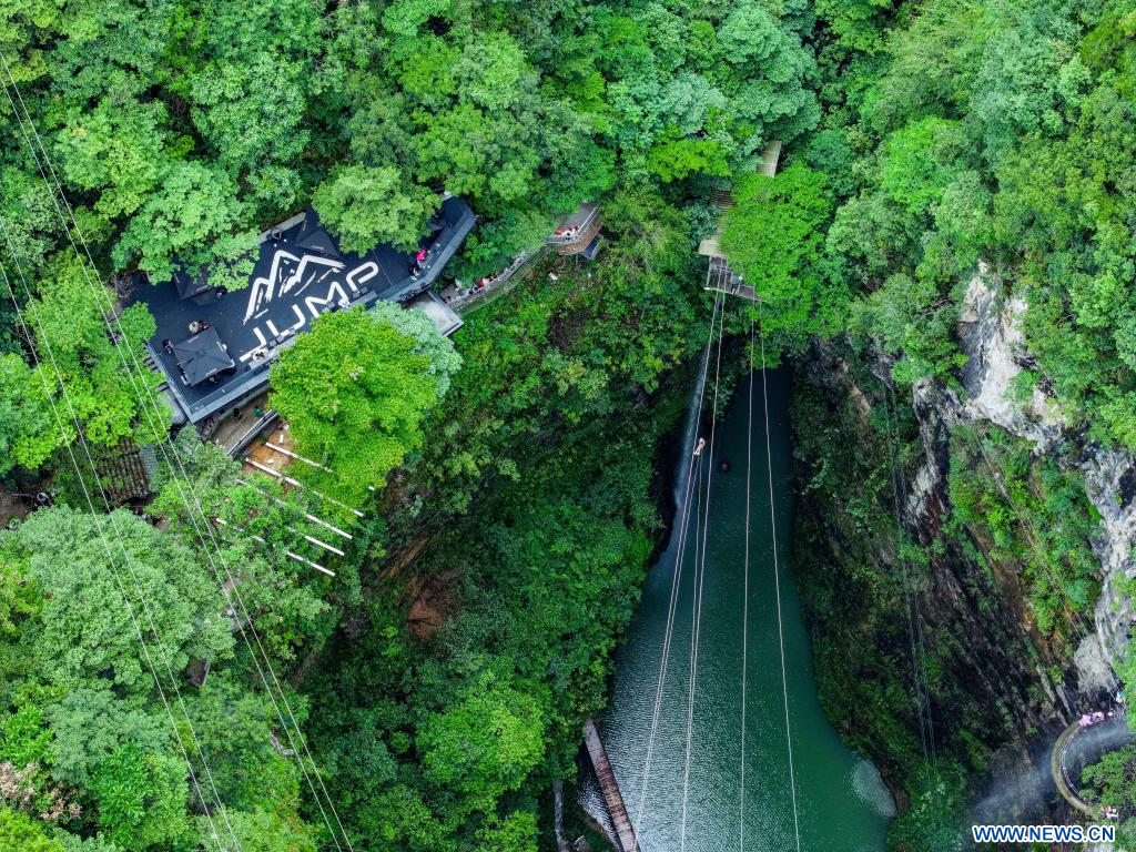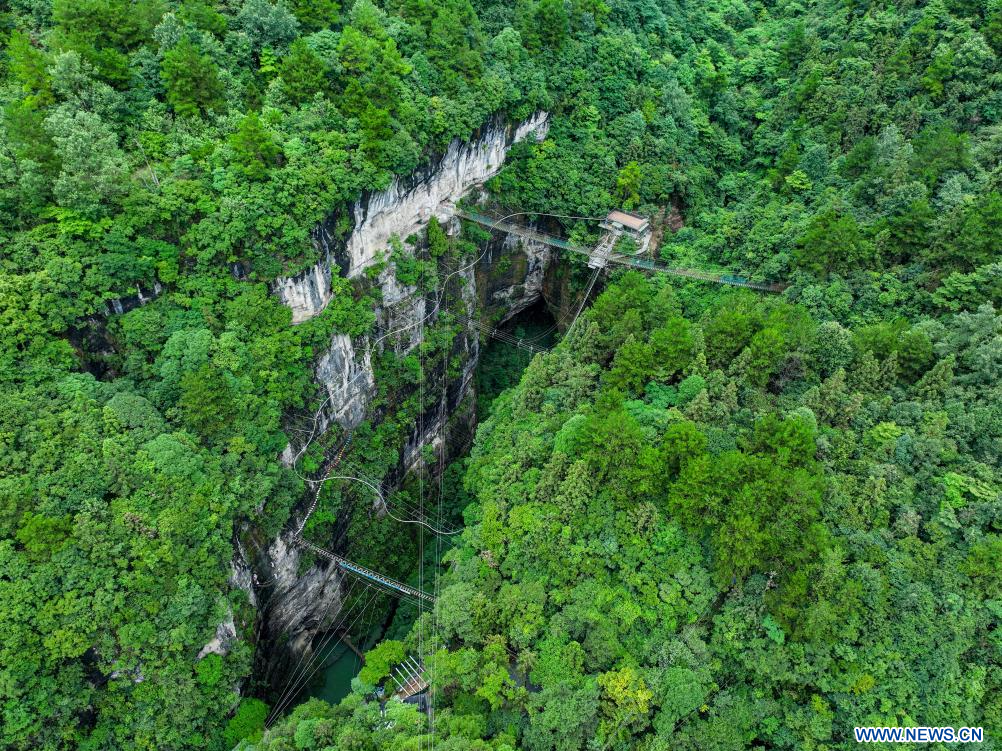GUIZHOU, 24 juillet (Xinhua) -- Photo aérienne prise par drone le 22 juillet 2025 montrant des touristes traversant un pont suspendu dans une doline géante située dans le district de Kaiyang, dans la province chinoise du Guizhou (sud-ouest).