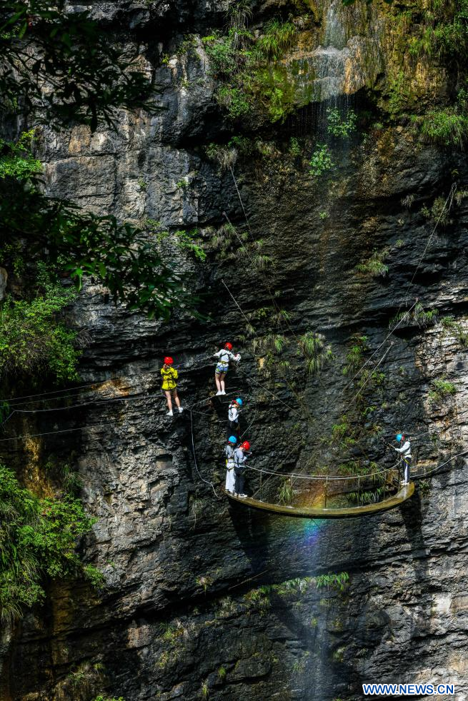 GUIZHOU, 24 juillet (Xinhua) -- Des touristes profitent d'un espace d'escalade dans une doline géante dans le district de Kaiyang, dans la province chinoise du Guizhou (sud-ouest), le 22 juillet 2025.