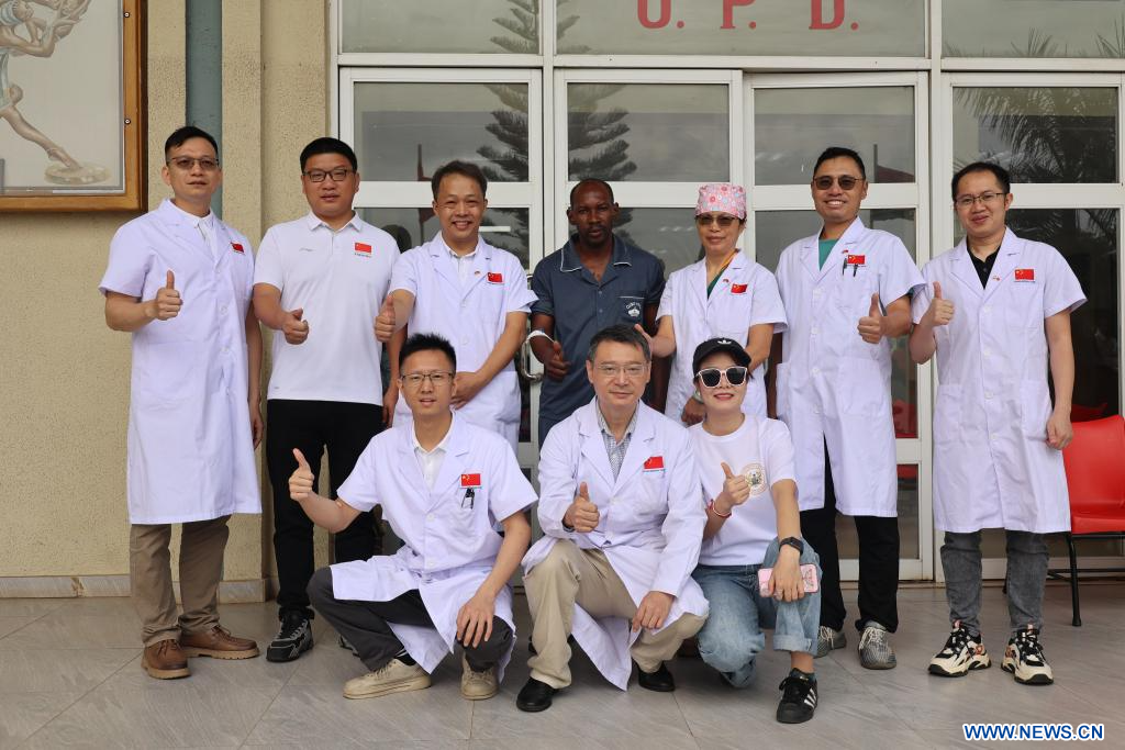 ACCRA, 26 juillet (Xinhua) -- Des membres de la 14e équipe médicale chinoise au Ghana posent pour une photo de groupe avec leur patient Godwin Segrah, le 25 juillet 2025, à Accra, au Ghana. Des médecins chinois et ghanéens ont réalisé mercredi avec succès la première réparation laparoscopique transabdominale d'une hernie de la paroi abdominale antérieure au sein du système hospitalier public de ce pays d'Afrique de l'Ouest. (Xinhua/Gao Jianfei)