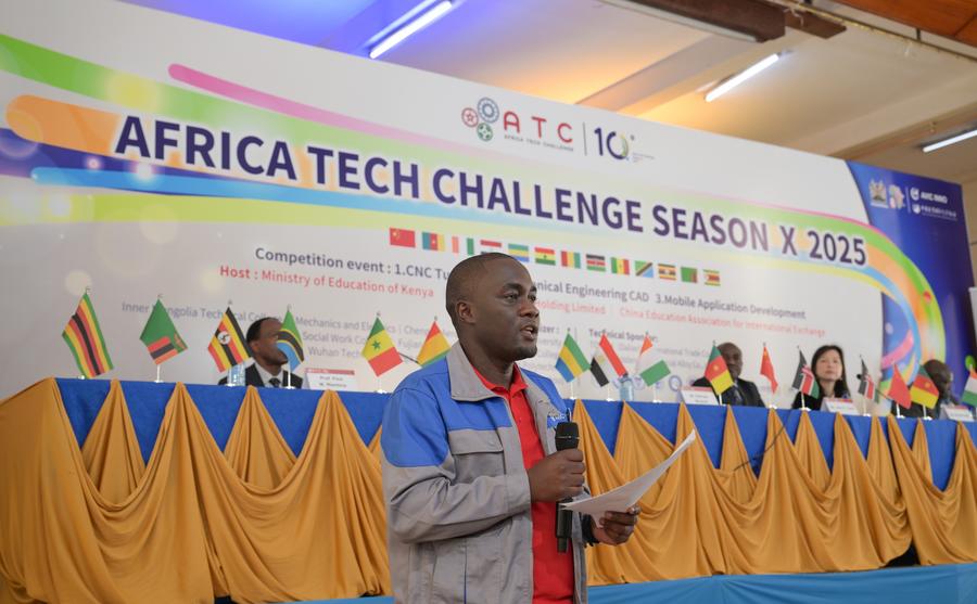 NAIROBI, 29 juillet (Xinhua) -- Newton Milimu, un représentant des participants ayant déjà pris part à l'Africa Tech Challenge (ATC), prononce un discours dans lequel il partage son expérience du concours lors de la cérémonie d'ouverture de la 10e édition de l'ATC, à Nairobi, capitale du Kenya, le 28 juillet 2025. Cet événement, parrainé par la société chinoise AVIC International, a officiellement débuté lundi, réaffirmant les efforts visant à doter les jeunes Africains de compétences techniques pratiques et adaptées au marché. Organisée par le ministère kenyan de l'Education, AVIC Innovation Holding Limited et l'Association chinoise pour l'éducation et les échanges internationaux, cette initiative rassemble 142 équipes composées de 568 participants issus de 12 pays africains. (Xinhua/Yang Guang)