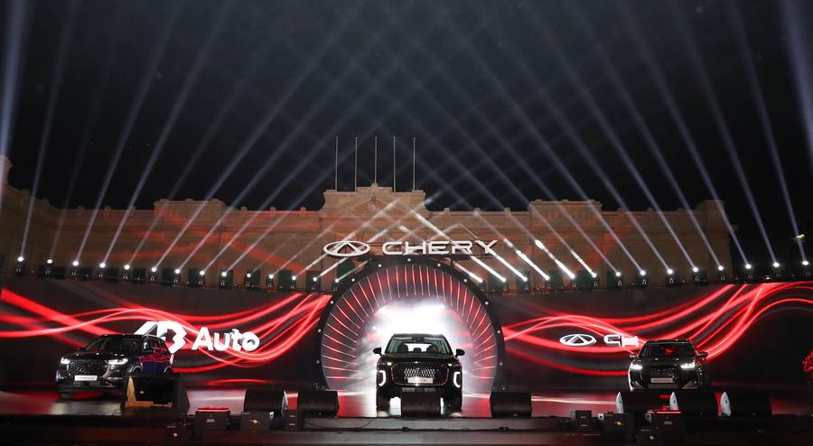 LE CAIRE, 28 juillet (Xinhua) -- Les visiteurs examinent un nouveau modèle Chery lors d'une cérémonie de lancement au Caire, en Egypte, le 28 juillet 2025. Le constructeur automobile chinois Chery a dévoilé cinq nouveaux modèles lundi dans le cadre de son expansion sur le marché égyptien. (Xinhua/Sui Xiankai)Les visiteurs examinent de nouveaux modèles Chery lors d'une cérémonie de lancement au Caire, en Egypte, le 28 juillet 2025. (Xinhua/Sui Xiankai)Une photo prise le 28 juillet 2025 montre trois nouveaux modèles Chery lors d'une cérémonie de lancement au Caire, en Egypte. (Xinhua/Sui Xiankai)■