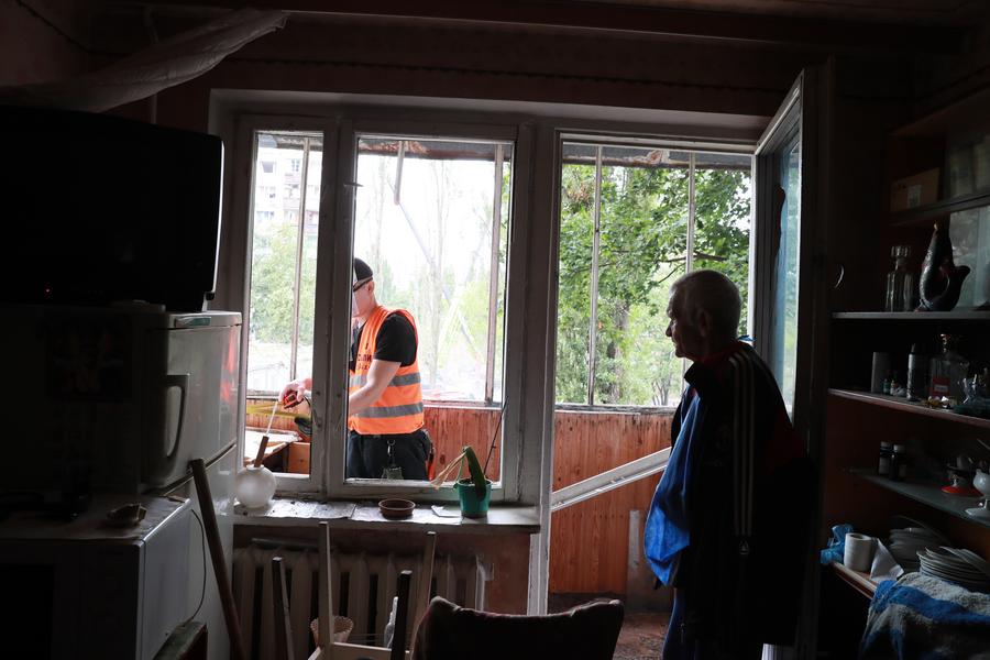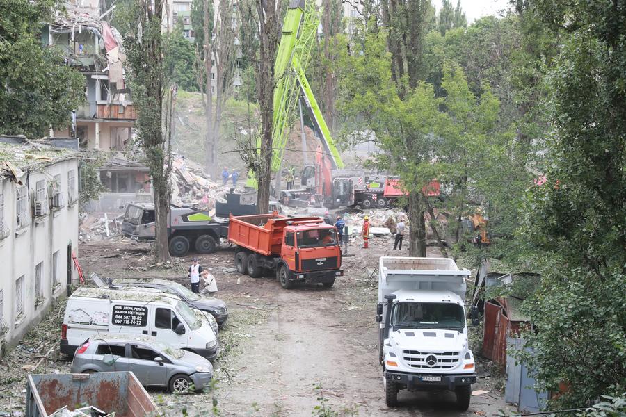 KIEV, 31 juillet (Xinhua) -- Des personnes inspectent les dégâts après une attaque russe dans le district de Sviatochyne à Kiev, en Ukraine, le 31 juillet 2025. (Xinhua/Li Dongxu)Des ouvriers dégagent les décombres après une attaque russe dans le district de Sviatochyne à Kiev, en Ukraine, le 31 juillet 2025. (Xinhua/Li Dongxu)Des gens près de l'épave d'un véhicule après une attaque russe dans le district de Sviatochyne à Kiev, en Ukraine, le 31 juillet 2025. (Xinhua/Li Dongxu)