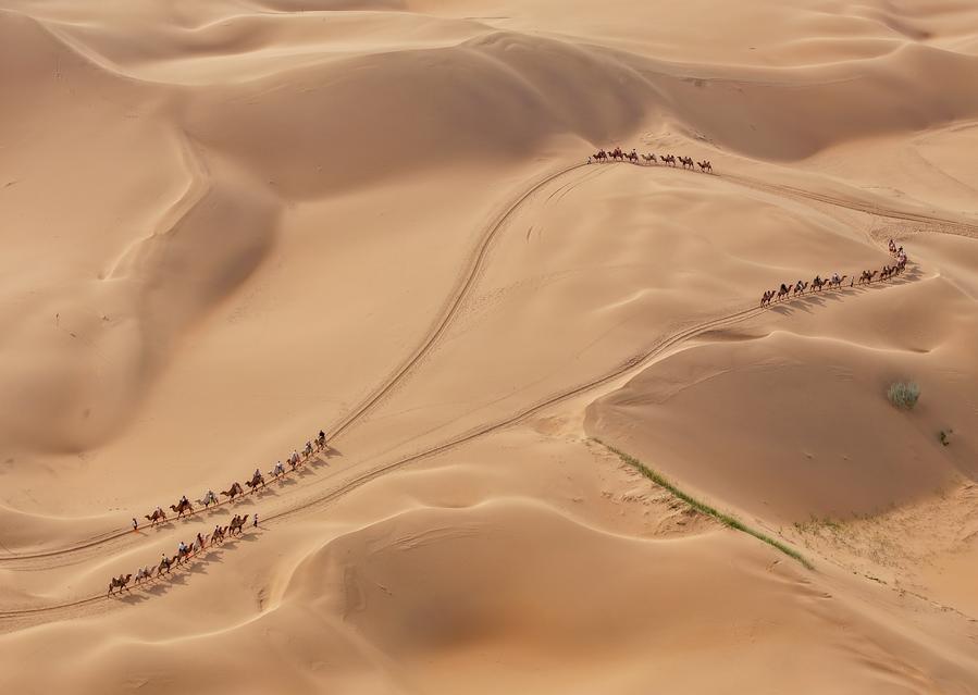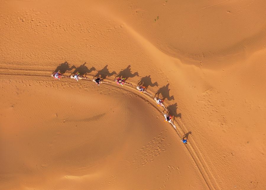 Photo aérienne prise par drone montrant des personnes à dos de chameau dans un site touristique désertique, dans la bannière de Dalad de la ville d'Ordos, dans la région autonome de Mongolie intérieure (nord de la Chine), le 1er août 2025. (Photo : Lian Zhen)