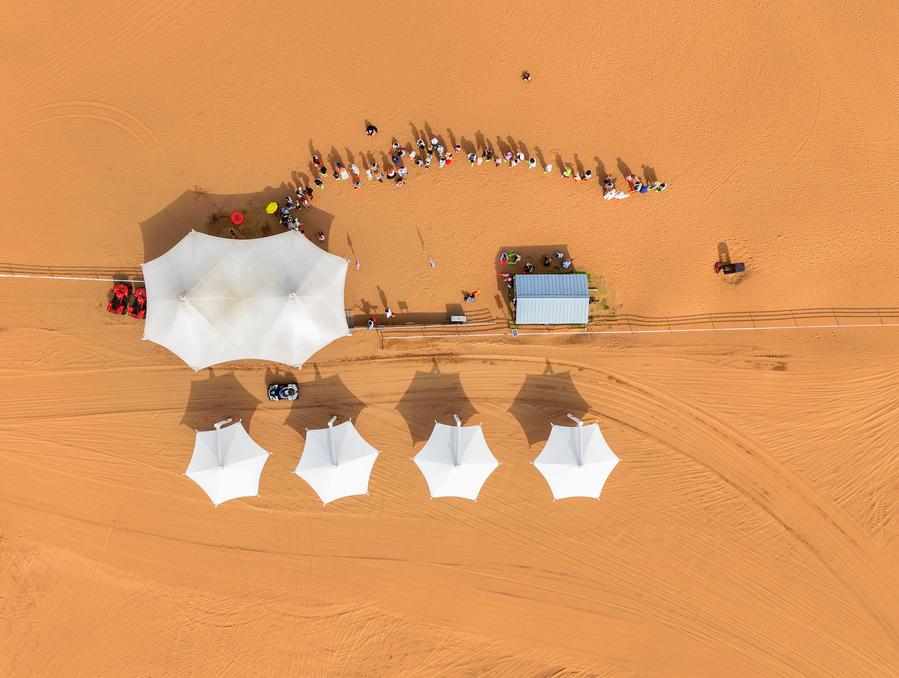 Photo aérienne prise par drone montrant des personnes à dos de chameau dans un site touristique désertique, dans la bannière de Dalad de la ville d'Ordos, dans la région autonome de Mongolie intérieure (nord de la Chine), le 1er août 2025. (Photo : Lian Zhen)Photo aérienne prise par drone montrant une file d'attente pour l'expérience de conduite tout-terrain dans le désert dans un site touristique désertique de la bannière de Dalad de la ville d'Ordos, dans la région autonome de Mongolie intérieure (nord de la Chine), le 1er août 2025.(Photo : Lian Zhen)Photo aérienne prise par drone montrant un site touristique désertique dans la bannière de Dalad de la ville d'Ordos, dans la région autonome de Mongolie intérieure (nord de la Chine), le 1er août 2025. (Photo : Lian Zhen)■