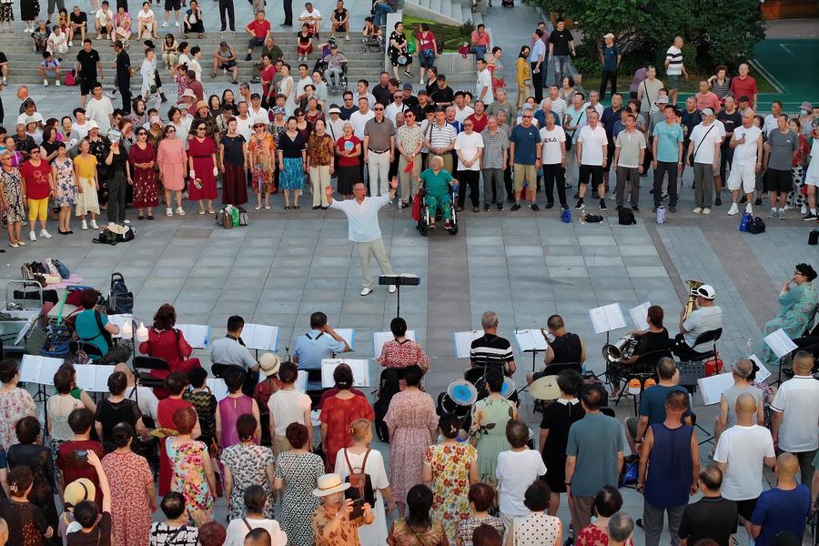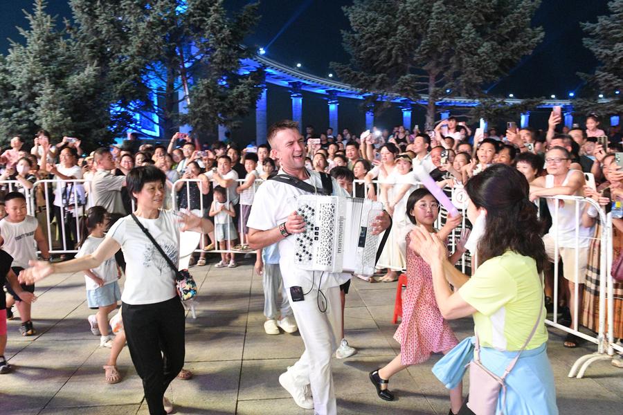 Des touristes s'amusent avec un accordéoniste russe sur une place de Harbin, dans la province chinoise du Heilongjiang (nord-est), le 22 juillet 2025. (Photo : Liu Yang)