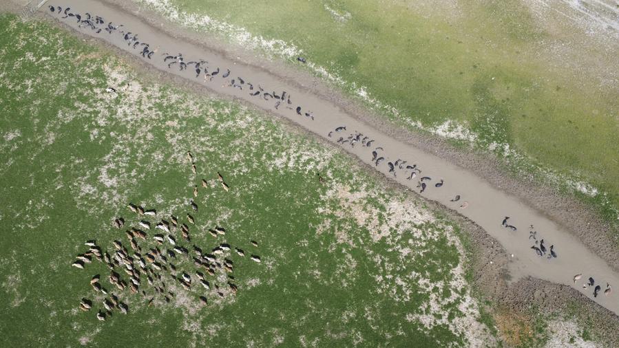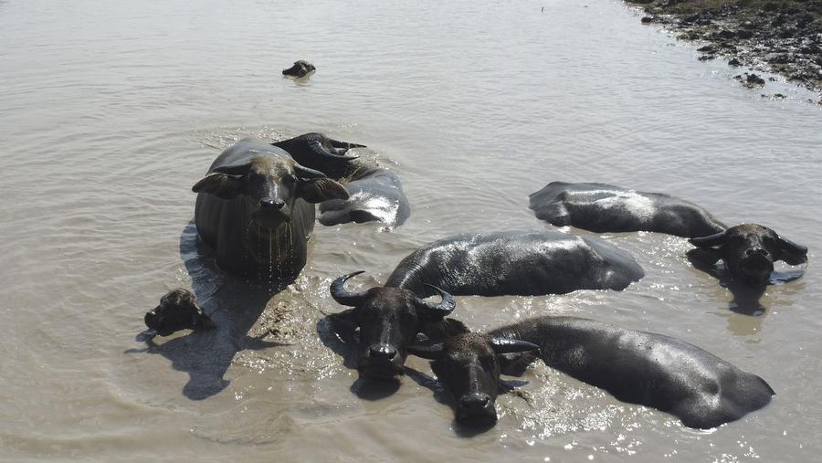 SUMATRA DU SUD, 2 août (Xinhua) -- Une photo aérienne prise par drone montre un troupeau de buffles d'eau à Tanjung Senai, un village de la province de Sumatra du Sud, en Indonésie, le 2 août 2025. L'Indonésie possède d'importantes ressources génétiques de buffles d'eau locaux, avec une bonne adaptation à travers les régions. Cependant, ces animaux déclinent à la fois en termes de population et de qualité génétique. (Xinhua/M. Hatta)Cette photo montre un troupeau de buffles d'eau à Tanjung Senai, un village de la province de Sumatra du Sud, en Indonésie, le 2 août 2025.
